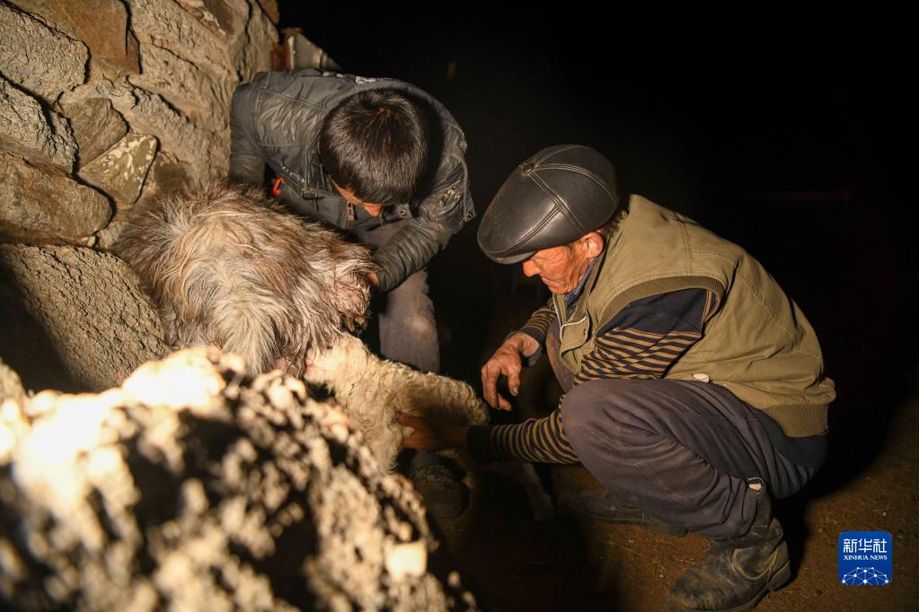深夜,哈布得拉什么(右)和兒子賽孜木一起幫助一只小羊羔吃奶(4月13日攝)。
