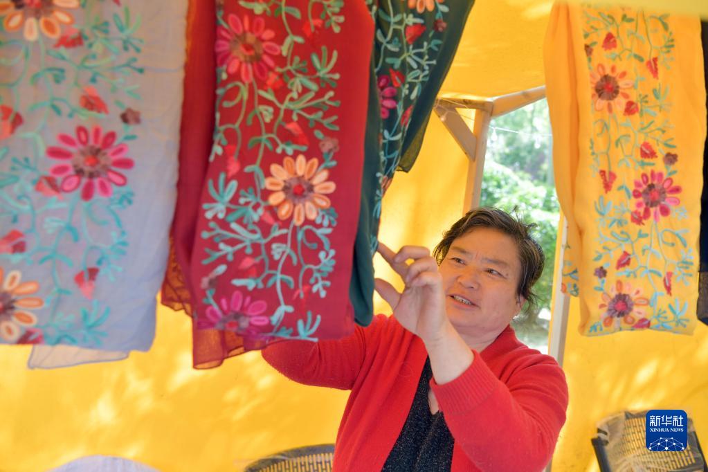4月18日,非遺傳承人在東營(yíng)市清風(fēng)湖黃河大集上介紹刺繡絲巾。
