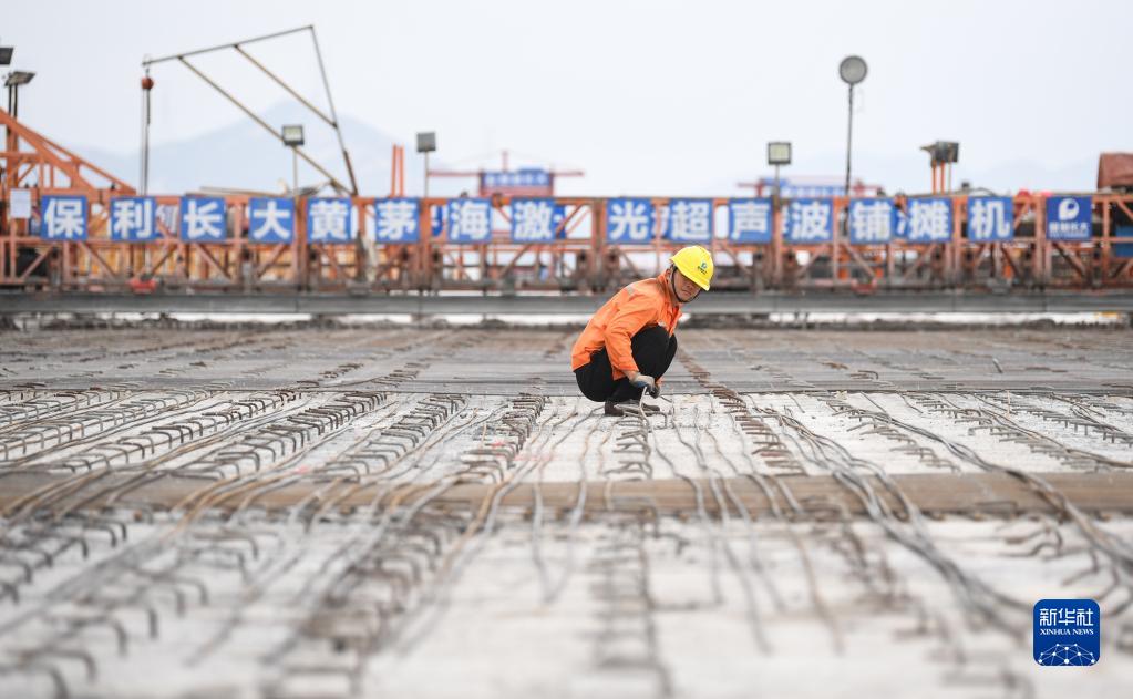 4月18日,工人在黃茅??绾Mǖ傈S茅海大橋鋪設鋼筋。