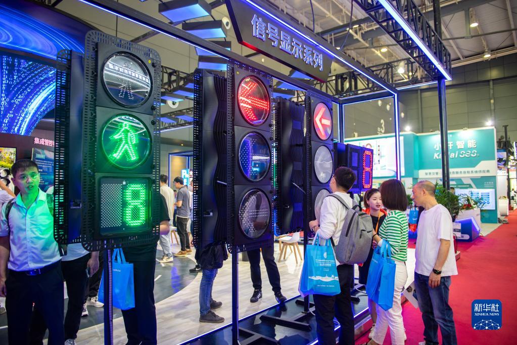 4月19日,在長(cháng)沙國際會(huì )展中心,觀(guān)眾在了解新款交通信號燈。