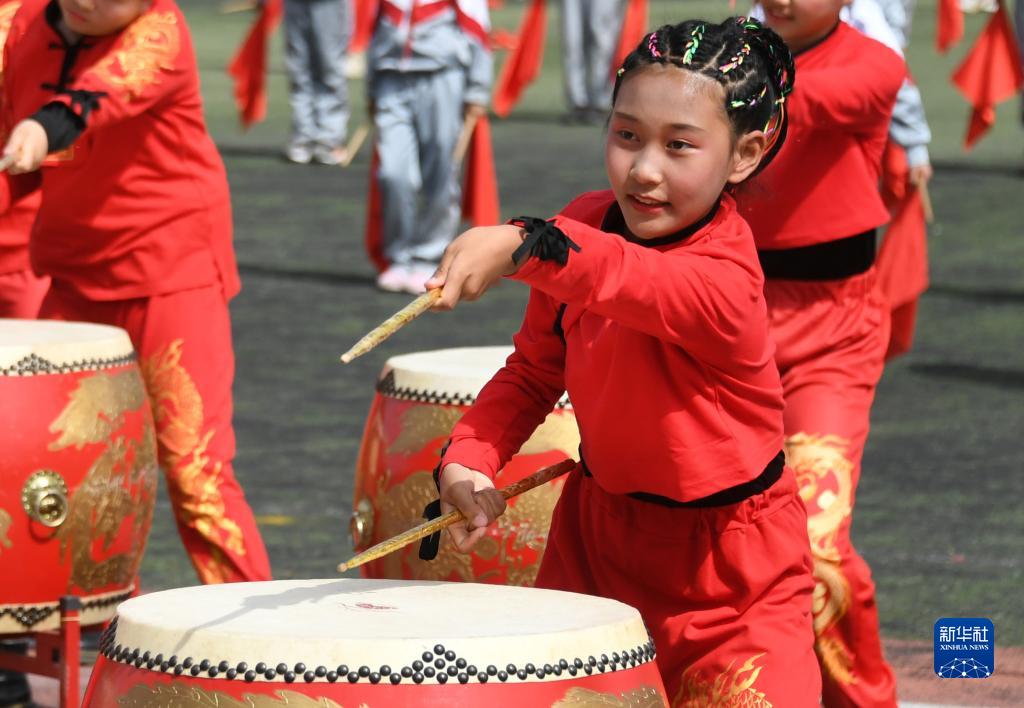 4月19日,門(mén)樓中心小學(xué)的學(xué)生在活動(dòng)中進(jìn)行鼓舞表演。