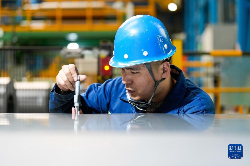 4月19日,工作人員在對取向電工鋼產(chǎn)品進(jìn)行檢測。