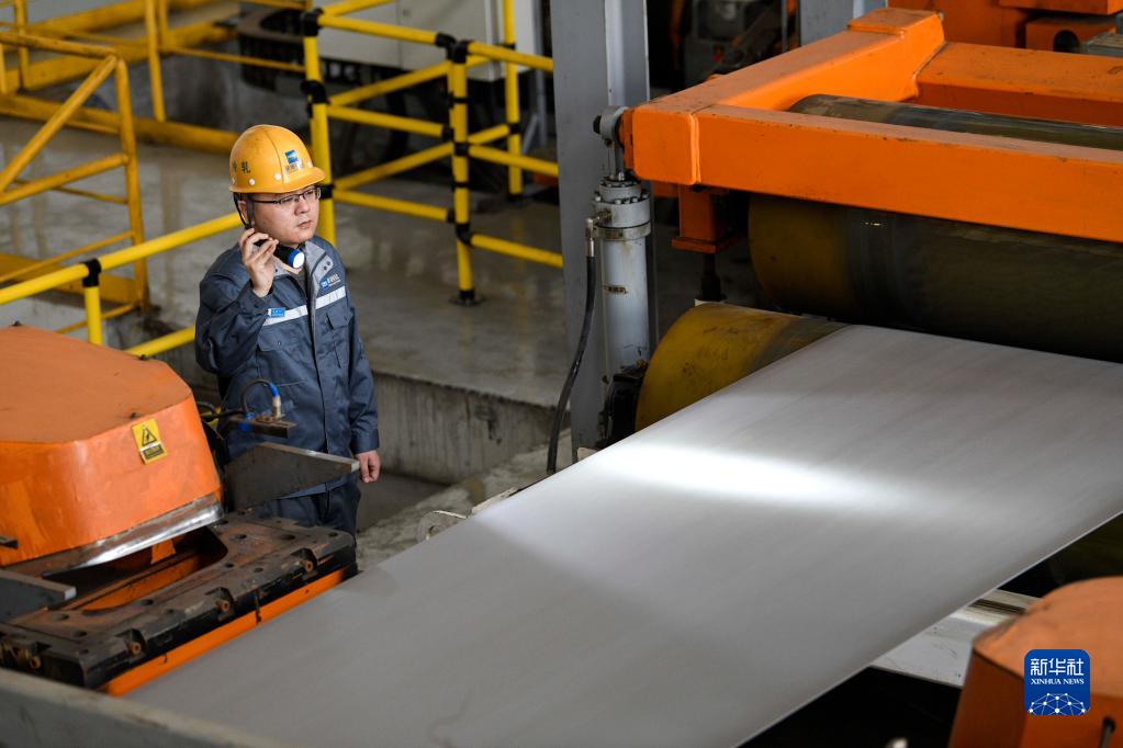 4月19日,在河北雙灤一家釩鈦新材料企業(yè)冷軋產(chǎn)品車(chē)間,工人在查看產(chǎn)品質(zhì)量。