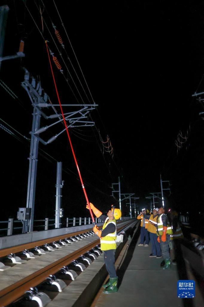 4月20日,中鐵武漢電氣化局工作人員在都勻東站附近的軌道上進(jìn)行驗電操作。
