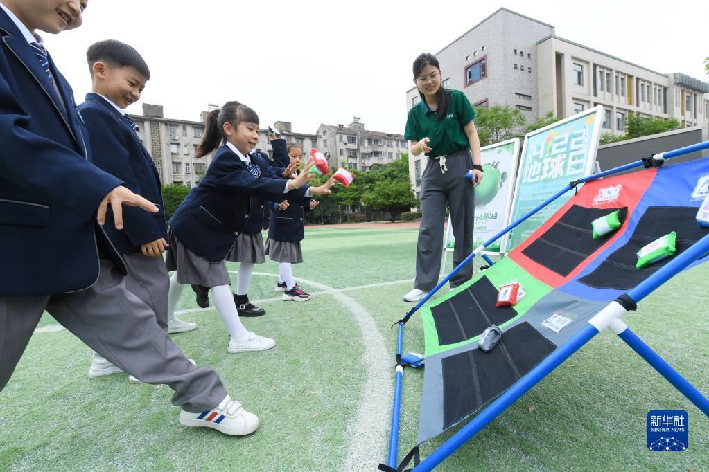 4月20日,湖州新風(fēng)實(shí)驗小學(xué)下塘校區的學(xué)生在城管辦工作人員帶領(lǐng)下做垃圾分類(lèi)趣味游戲。