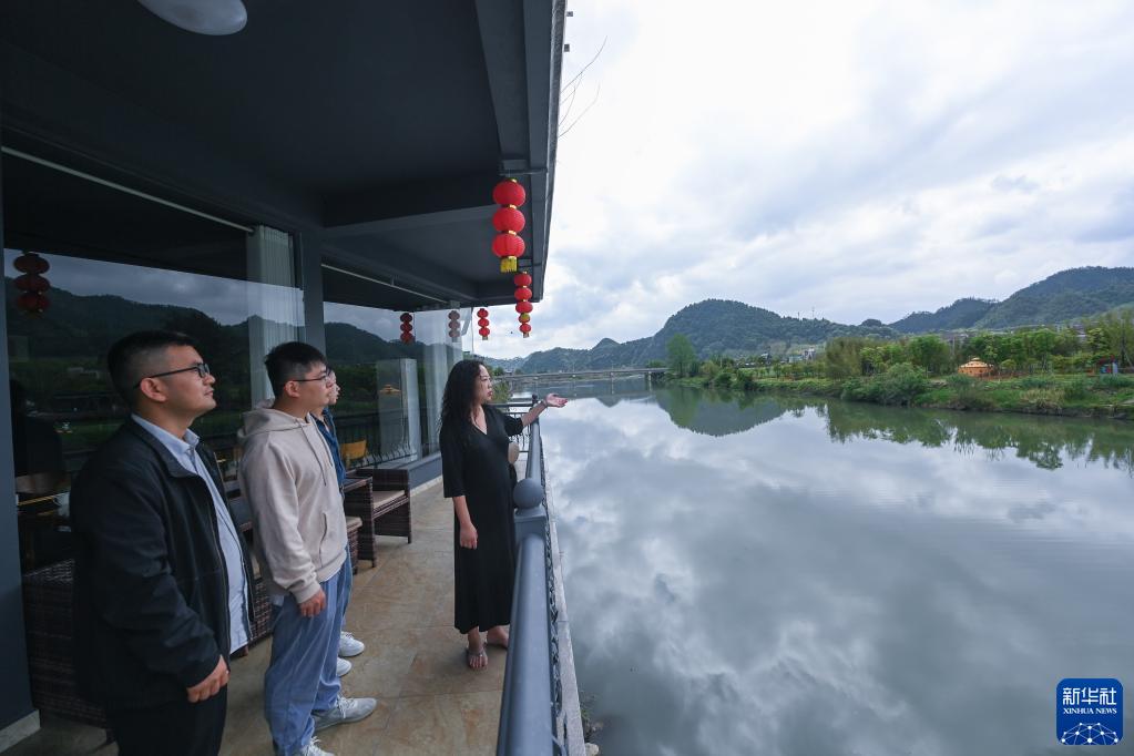 4月20日,在杭州市臨安區昌化鎮白牛村,羅星玥(右一)向游客介紹白牛村的自然風(fēng)光。2022年,羅星玥帶著(zhù)運營(yíng)團隊在白牛村布局牛文化博物館、鄉村小酒館等業(yè)態(tài),成為白牛村村落景區的投資運營(yíng)商。