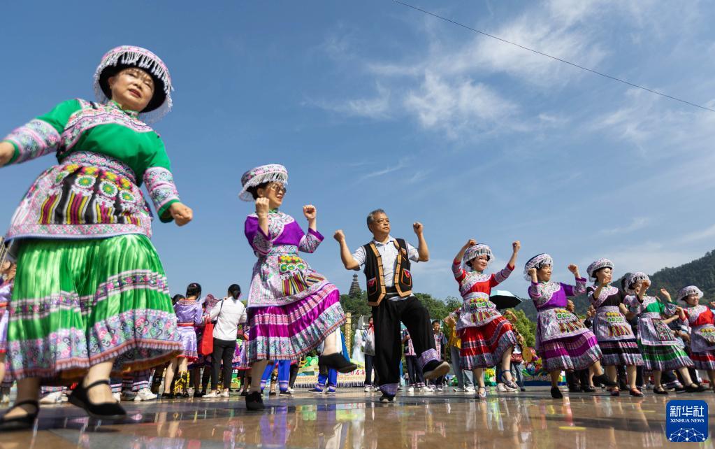 當日,四川省級非遺“興文苗族花山節”展示傳承活動(dòng)在四川省興文縣市民廣場(chǎng)舉行?;顒?dòng)上融入傳統祭祀、農耕文化、民族團結等內容的展演和苗家長(cháng)桌美食宴,讓賓客感受到熱烈的節日氛圍。