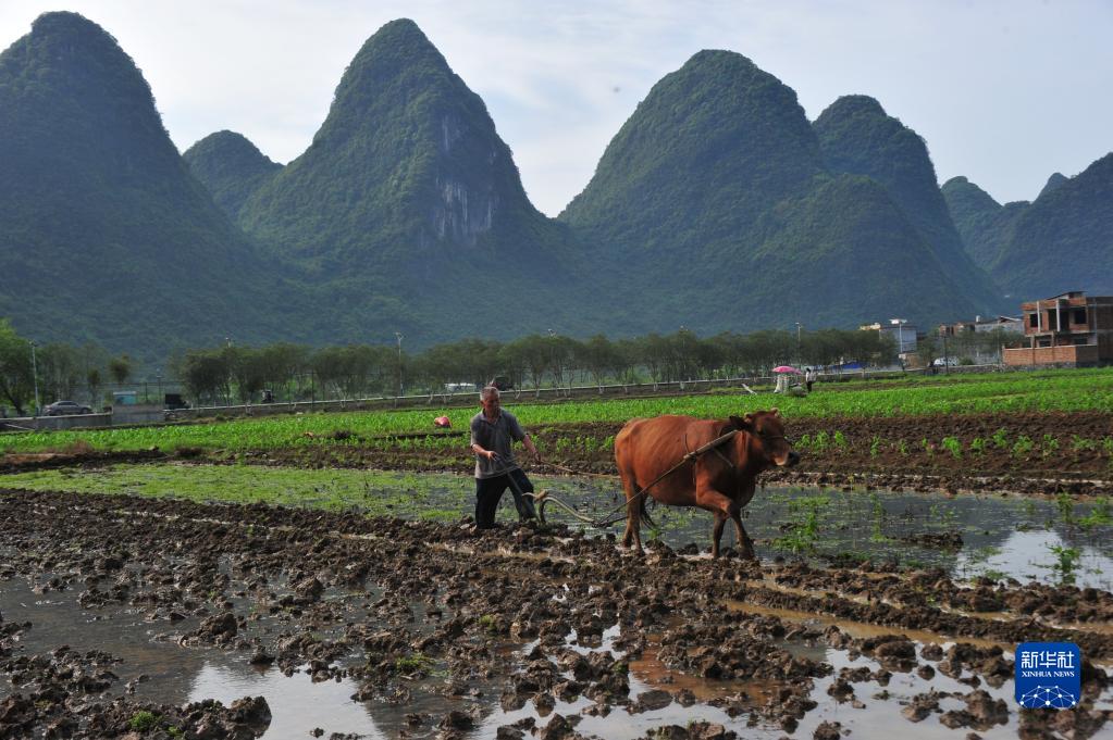4月20日,廣西河池市羅城縣東門(mén)鎮永安村大地賣(mài)屯農民在犁田。