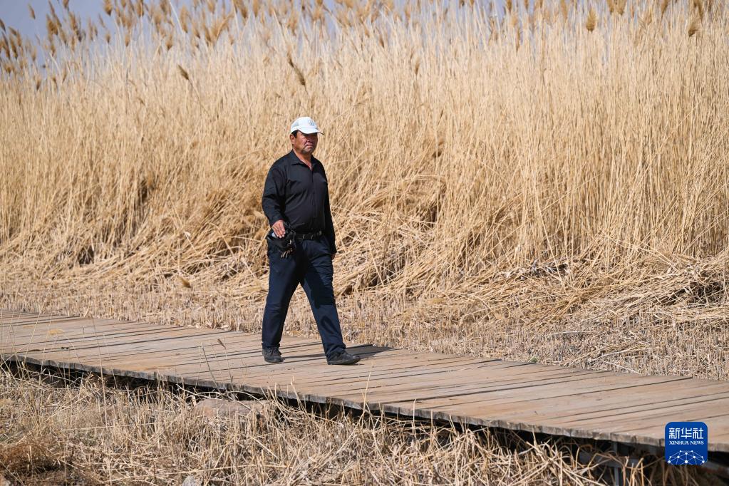 4月19日,胡登雨在岱海自然保護區巡護。