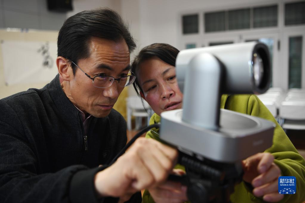 朱彥軍和同事在靜寧縣文化館調試設備,為“世界讀書(shū)日”活動(dòng)做準備(4月10日攝)。新華社記者 方欣 攝