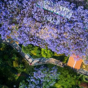昆明市教場(chǎng)中路的藍花楹綻放(無(wú)人機照片,4月22日攝)。