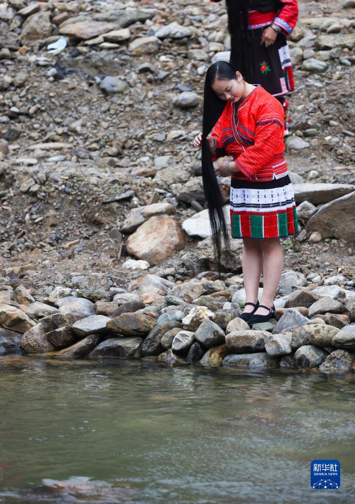 4月22日,一名瑤族婦女在河邊梳洗長(cháng)發(fā)。