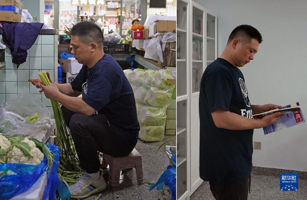 拼版照片:左圖為奎照路菜市場(chǎng)的蔬菜經(jīng)營(yíng)戶(hù)韓俊強在攤位上捆扎蔬菜;右圖為韓俊強在菜場(chǎng)書(shū)屋借閱雜志(4月20日攝)。