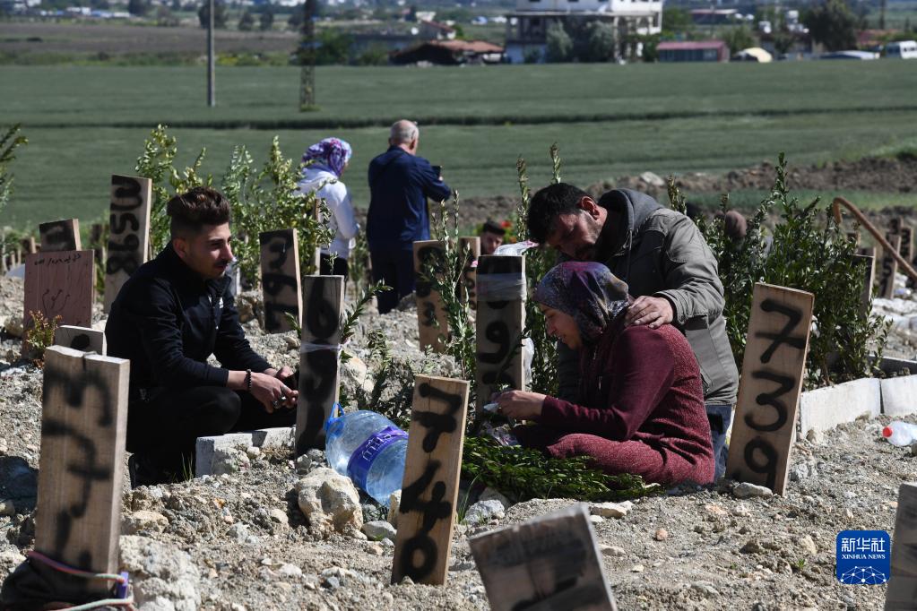 4月23日,人們在土耳其哈塔伊一處墓地悼念在地震中遇難的親人。新華社發(fā)(穆斯塔法·卡亞 攝)