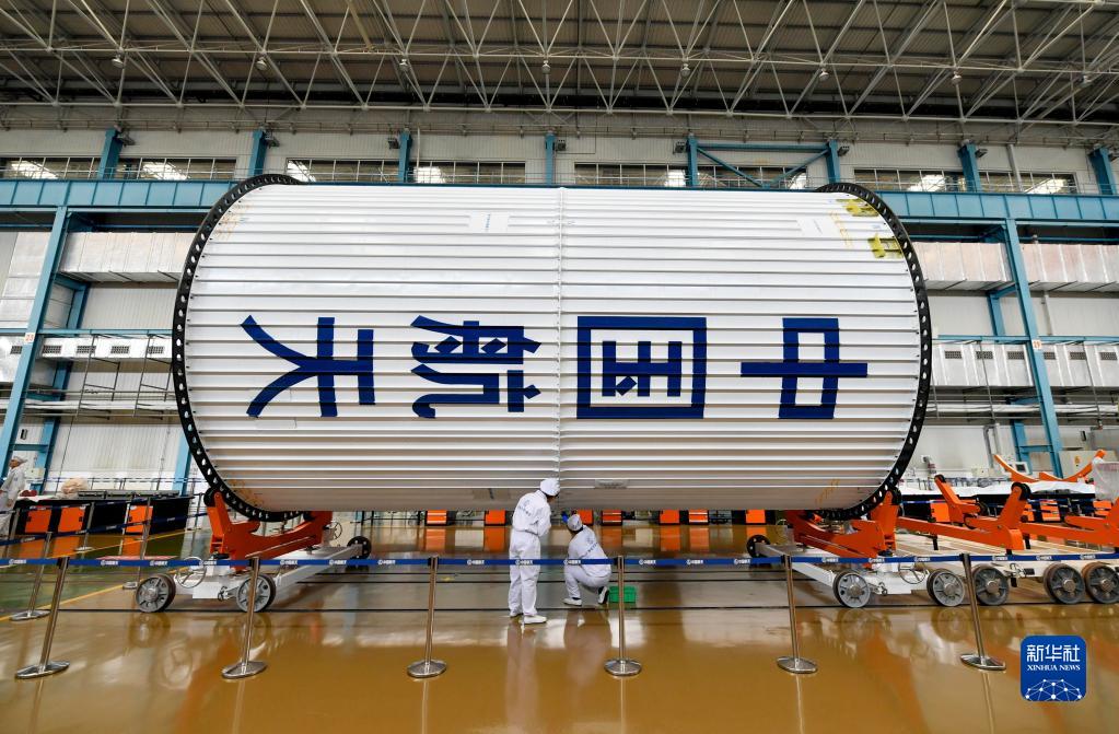 在航天科技集團一院天津火箭公司總裝測試車(chē)間,裝配一組班組成員在進(jìn)行火箭裝配(4月19日攝)。