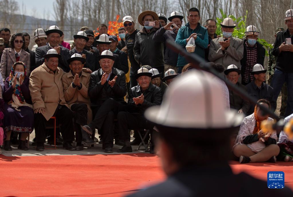 新疆克孜勒蘇柯?tīng)柨俗巫灾沃輨e迭里村,觀(guān)眾為《瑪納斯》非物質(zhì)文化遺產(chǎn)傳承人阿不都別克·俄斯坎的表演鼓掌喝彩(4月10日攝)。