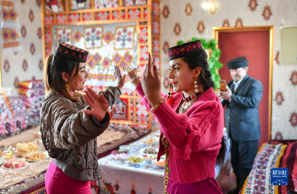 新疆塔什庫爾干塔吉克自治縣愛(ài)民村,牧民都熱·加爾曼的侄女古扎麗努爾(前右)帶著(zhù)好朋友來(lái)串門(mén)拜訪(fǎng),都熱·加爾曼在一旁拍攝視頻(3月21日攝)。2018年冬,都熱一家享受易地扶貧搬遷政策,搬遷至距離縣城約30公里的新村。在惠民政策的引導下,都熱一家靠雙手創(chuàng )造了與祖輩不同的新生活。