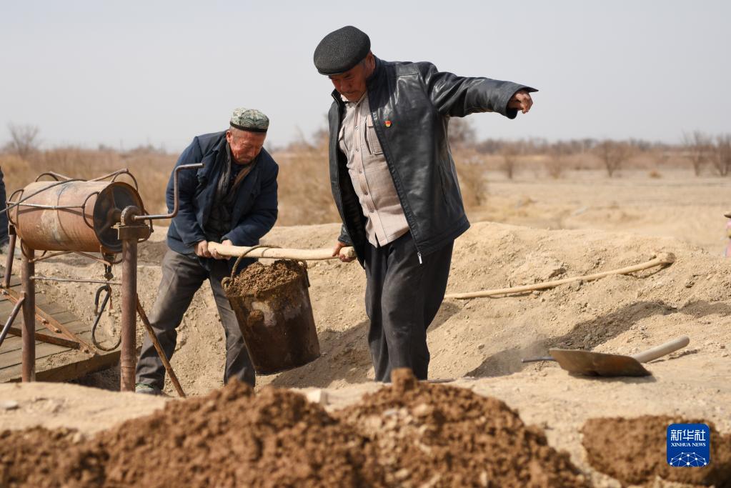 新疆吐魯番市高昌區艾丁湖鎮附近的戈壁灘,花園村掏撈隊隊員傾倒坎兒井內掏出的淤泥(3月9日攝)??矁壕划數厝朔Q(chēng)為“母親河”,由豎井、暗渠、明渠和蓄水池(澇壩)組成,是荒漠地區利用地面坡度無(wú)動(dòng)力引用地下水的一種獨特地下水利工程。