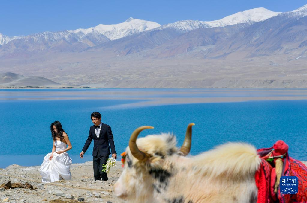 新疆阿克陶縣境內的白沙湖風(fēng)景區,一對年輕人在湖邊拍攝婚紗照(4月14日攝)。