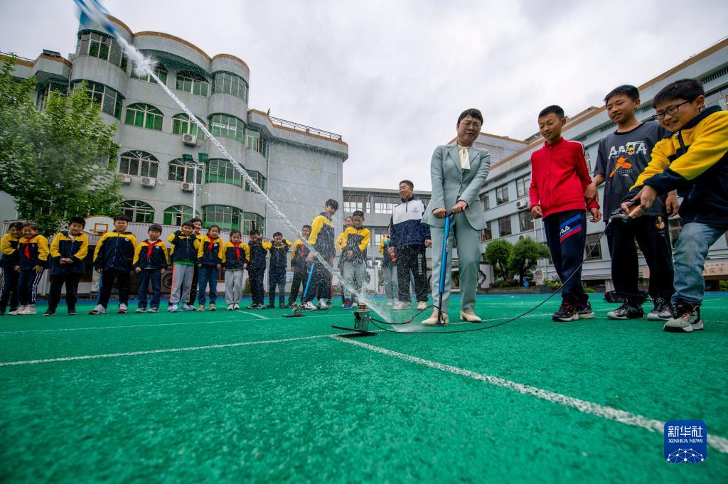 4月24日,在浙江省金華師范學(xué)校附屬小學(xué)操場(chǎng)上,學(xué)生體驗發(fā)射利用塑料瓶自制的“水火箭”。