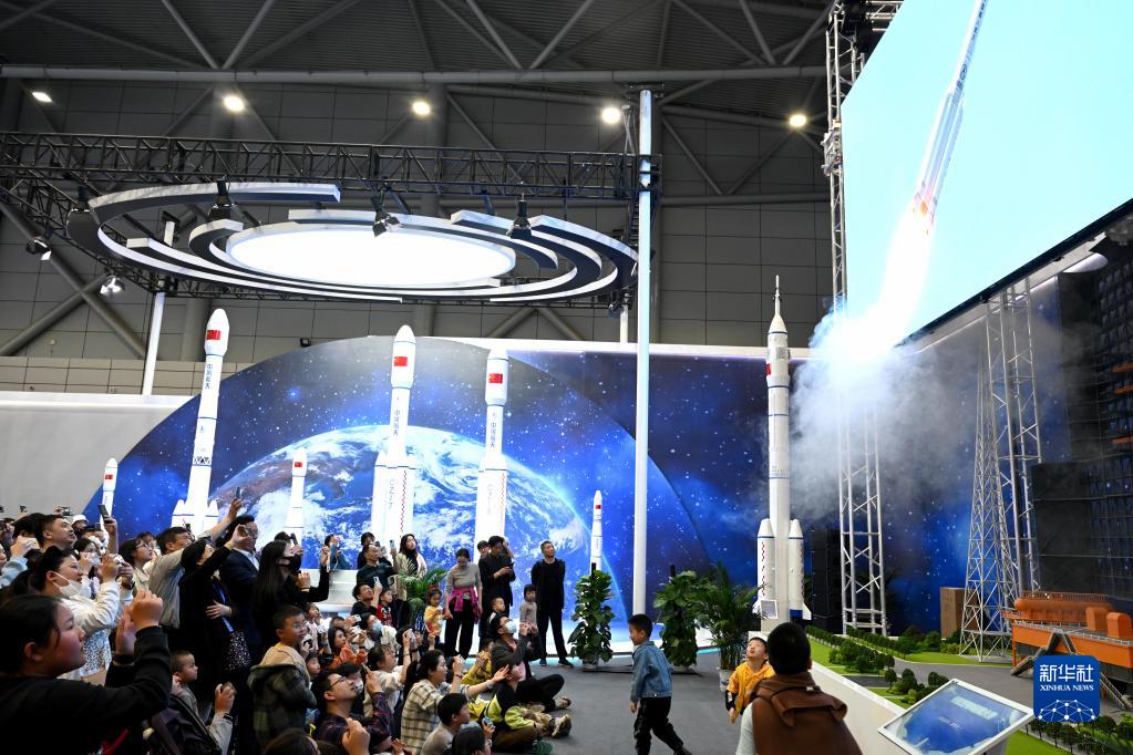 4月24日,觀(guān)眾在科普展區觀(guān)看長(cháng)征五號B運載火箭模擬發(fā)射。