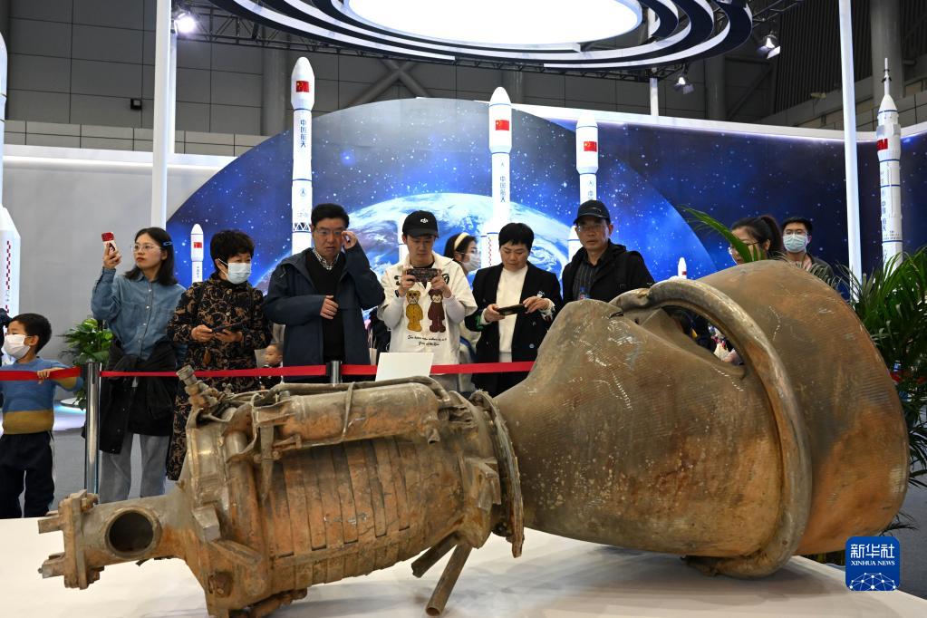 4月24日,觀(guān)眾在科普展區參觀(guān)長(cháng)征三號乙運載火箭發(fā)動(dòng)機殘骸實(shí)物展品。
