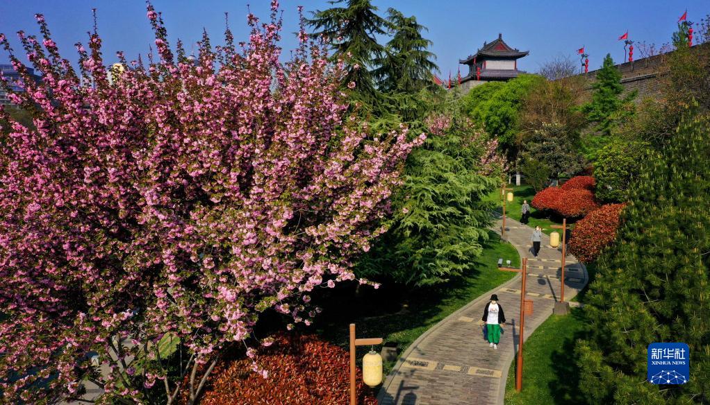 西安明城墻下春花盛開(kāi)(4月1日攝,無(wú)人機照片)。