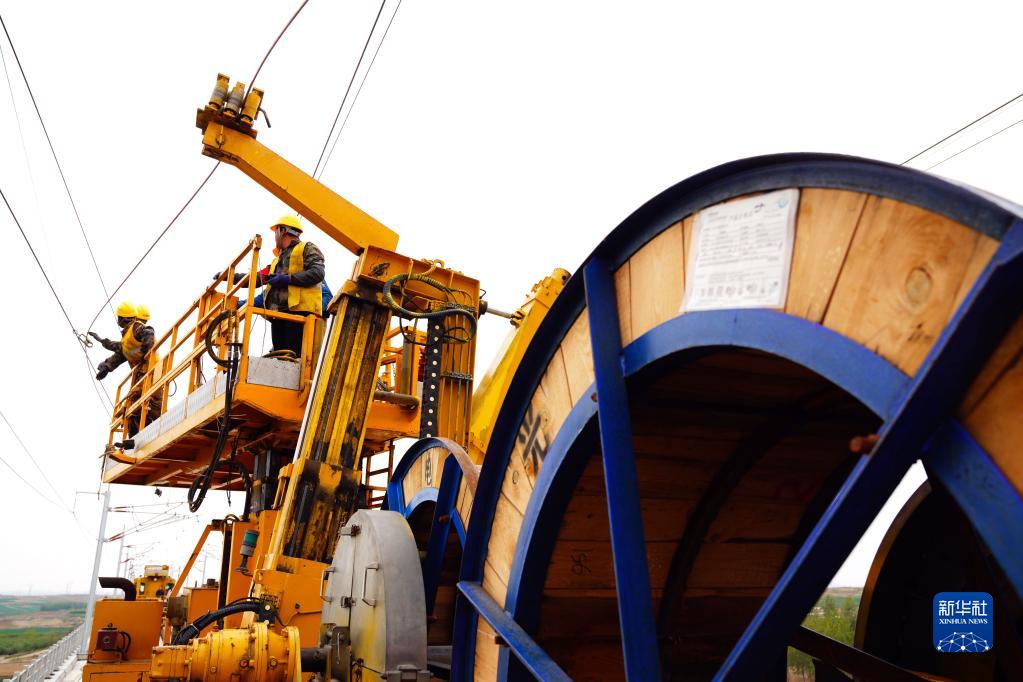 4月25日,在萊榮高鐵萊陽(yáng)南站至海陽(yáng)站區間,中鐵電氣化局的工作人員在進(jìn)行接觸網(wǎng)作業(yè)。