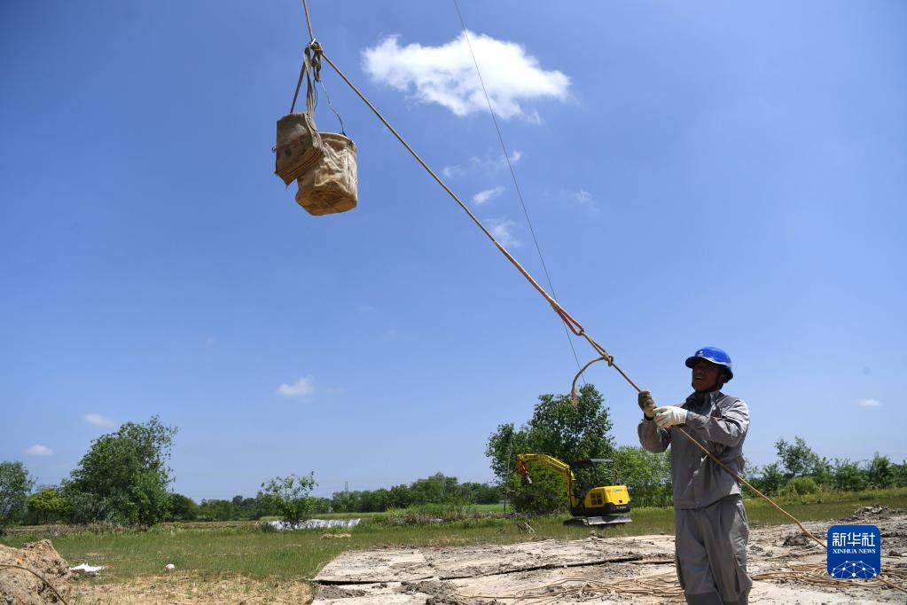 中午時(shí)分,工友通過(guò)吊繩為在塔上施工的劉李家、段信陽(yáng)、王春龍送午飯(4月20日攝)。