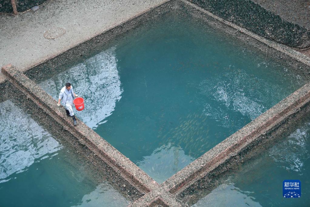 在廣東珠海萬(wàn)山海域,中國首臺半潛式波浪能養殖旅游平臺“澎湖號”上,工作人員走過(guò)養殖區域(4月25日攝)。