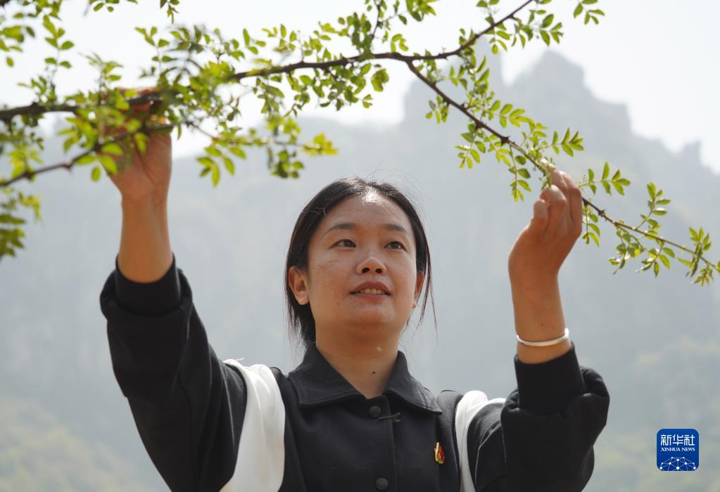 陳曉麗在賢麻溝村查看花椒長(cháng)勢(4月18日攝)。新華社記者 李嘉南 攝