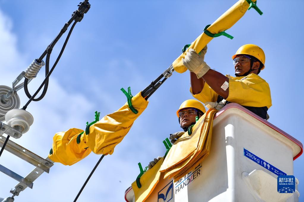 4月26日,扎西尼瑪(右)和徒弟在進(jìn)行高空帶電作業(yè)演練。