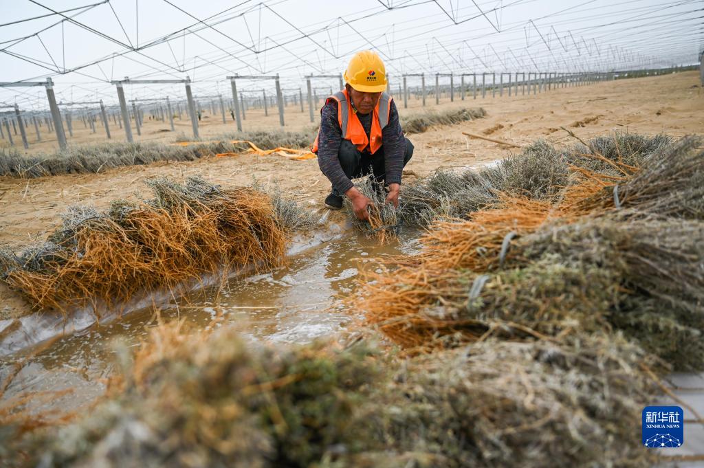 4月26日,工人在億利庫布其沙漠光伏治沙基地取苗木。