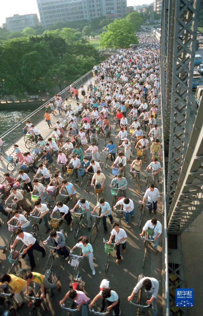 1989年廣州騎自行車(chē)上班的人流(資料照片)。