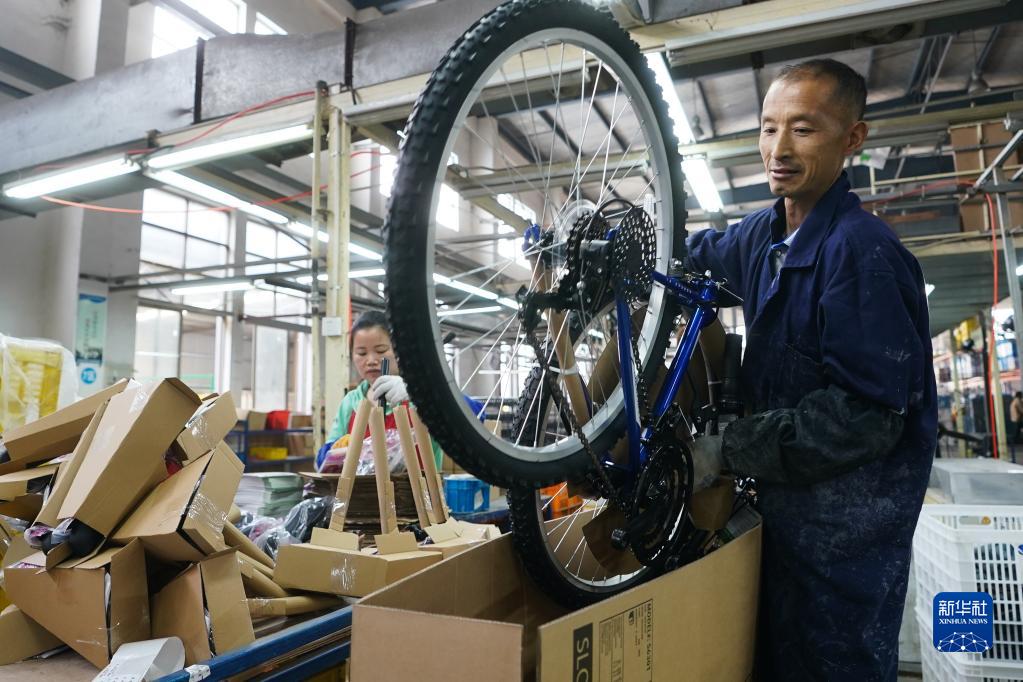 4月12日,在位于江蘇省句容市的江蘇泰茂車(chē)業(yè)有限公司,工人將自行車(chē)產(chǎn)品裝箱。