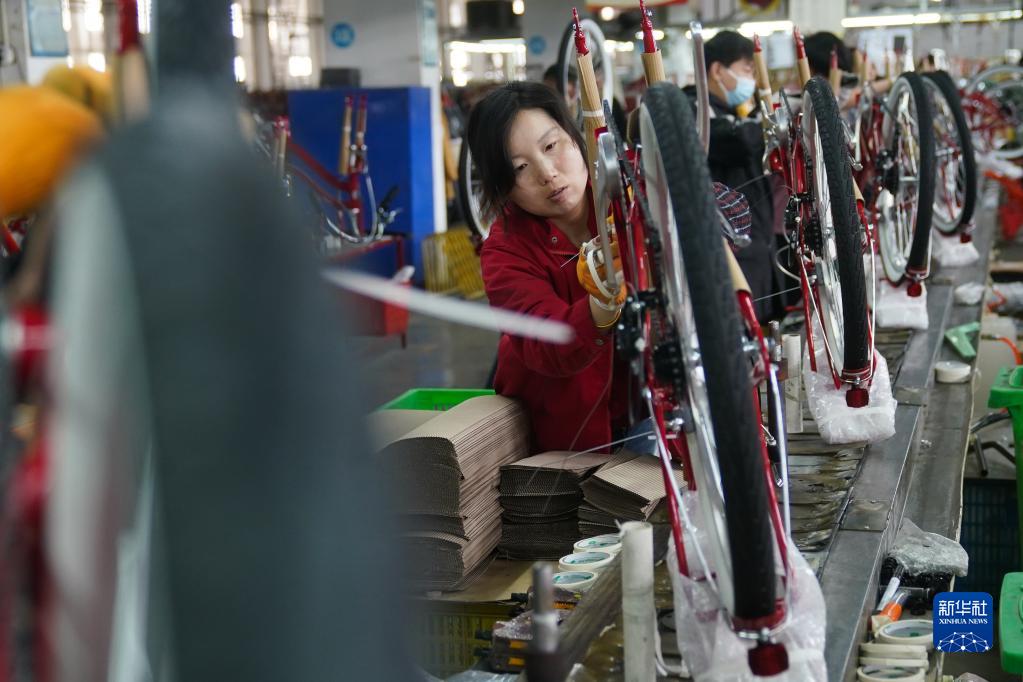 4月12日,在位于江蘇省句容市的江蘇泰茂車(chē)業(yè)有限公司,工人在自行車(chē)生產(chǎn)線(xiàn)上忙碌。