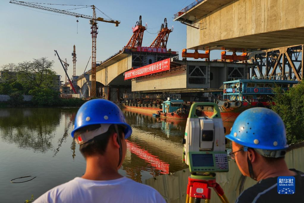 中鐵三局技術(shù)人員在流溪河特大橋重達千噸的鋼箱梁主梁進(jìn)行吊裝過(guò)程中測控(4月26日攝)。
