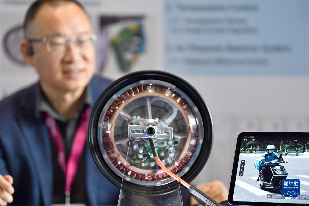 4月26日,在瑞士日內瓦,一名來(lái)自中國的發(fā)明家在第48屆日內瓦國際發(fā)明展上展示一款電驅系統。