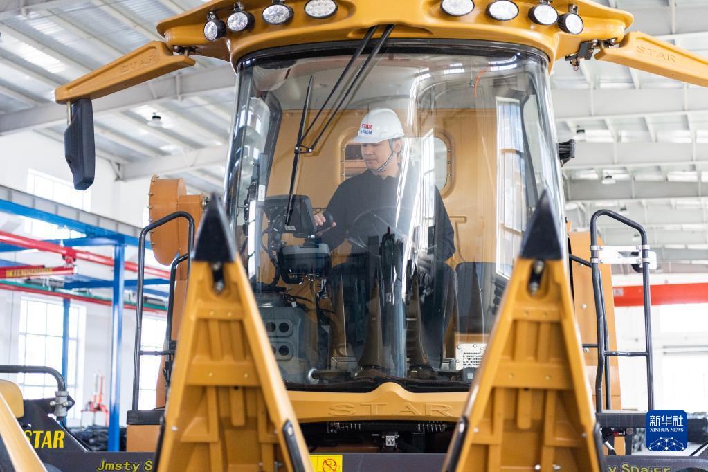 4月26日,宮照旭在公司生產(chǎn)車(chē)間內試駕其自主研發(fā)生產(chǎn)的全地形履帶式玉米收割機。