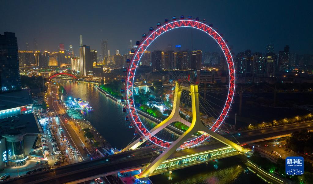 4月27日晚拍攝的“天津之眼”摩天輪夜景(無(wú)人機照片)。