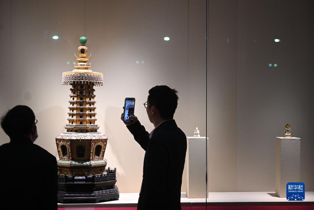 4月28日,嘉賓在北京故宮博物院參觀(guān)金嵌寶石八角佛塔。