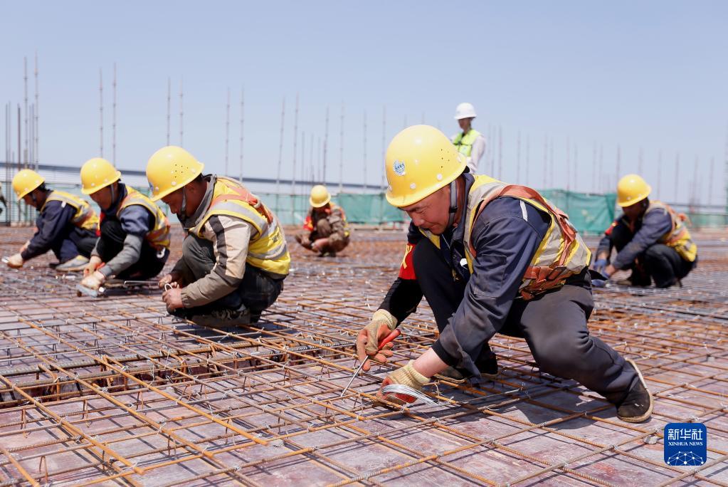4月28日,在位于山東省青島市即墨區的中建八局四公司一處項目工地,建筑工人參加鋼筋綁扎項目比賽。