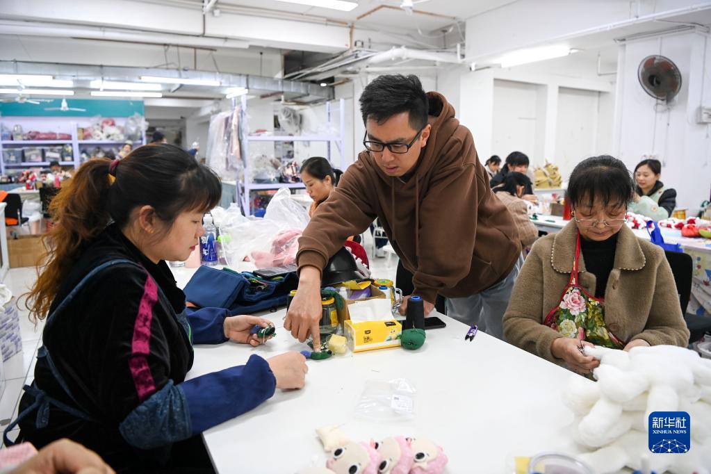 4月26日,蒙揚文(中)在廣西桂林市龍勝各族自治縣的一處生產(chǎn)車(chē)間給繡娘指導縫制技術(shù)。