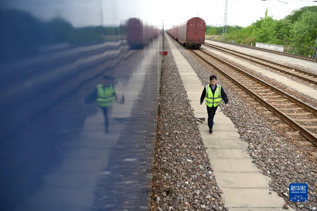 4月28日,尚志雄在巡查中歐班列機車(chē)。新華社記者 劉軍喜 攝