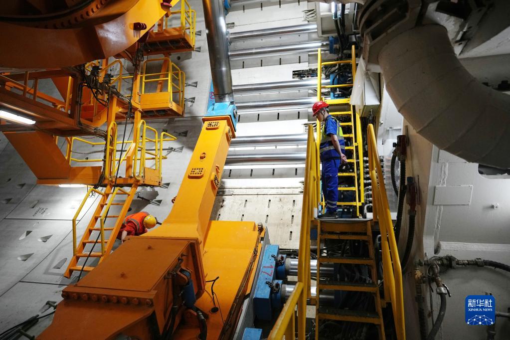 在盾構機推進(jìn)一環(huán)結束后的管片拼裝期間,黃魯(右)在旁站管片拼裝(4月19日攝)。