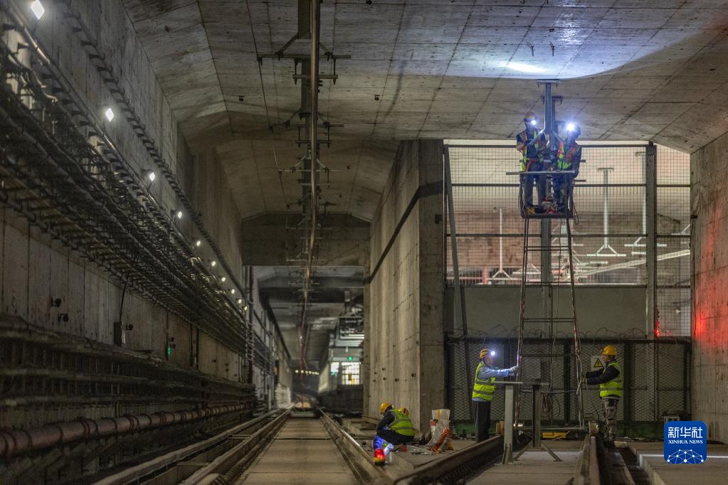 4月29日凌晨,在重慶軌道交通九號線(xiàn)保稅港站,中建五局安裝公司的施工人員利用夜間窗口期進(jìn)行接觸網(wǎng)施工。