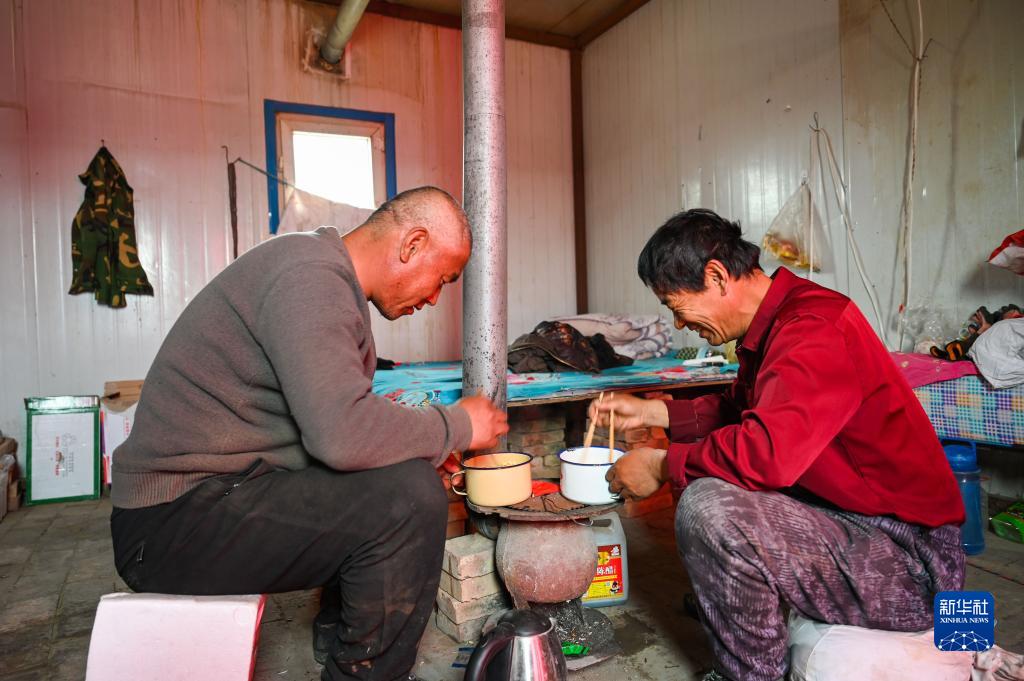 干完活回到臨時(shí)板房后,治沙客毛福平(左)和老鄉劉金成在吃泡面(4月27日攝)。