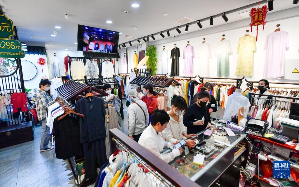 4月29日,游客在天津古文化街一家服裝店購物。