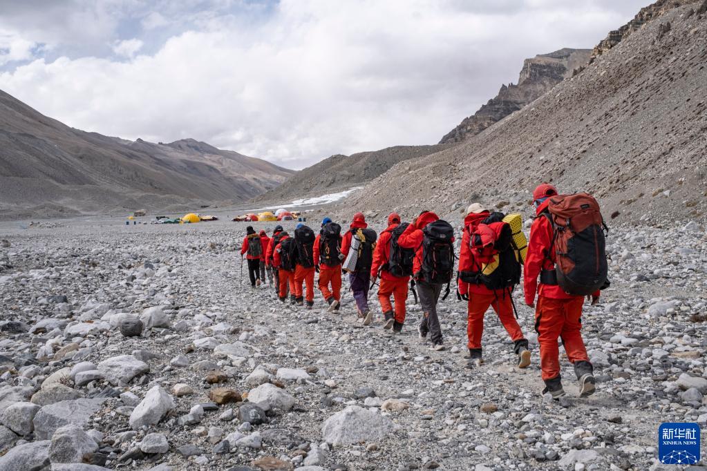 “巔峰使命”珠峰科考隊員在完成登頂科考任務(wù)后,返回海拔5200米的珠峰大本營(yíng)(2022年5月5日攝)。