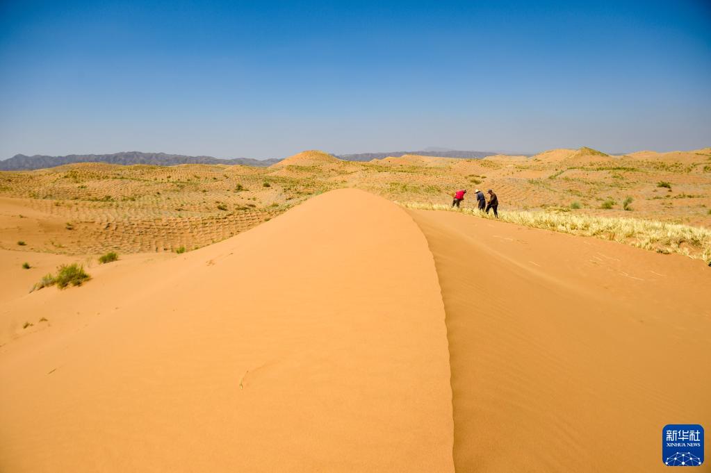 治沙工人在寧夏中衛市長(cháng)流水沙區扎制草方格(2019年6月13日攝)。